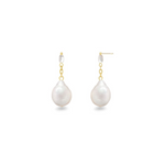 Immerse yourself in the lightness and flair of the Ocean line, featuring uneven freshwater pearls and asymmetry. Adorned with a large pearl, Ocean Earrings are ideal for summer parties and events. Seen here in shiny 14K gold plating, the earrings have a small pearl in the clasp and a large one connected by a beveled anchor chain.