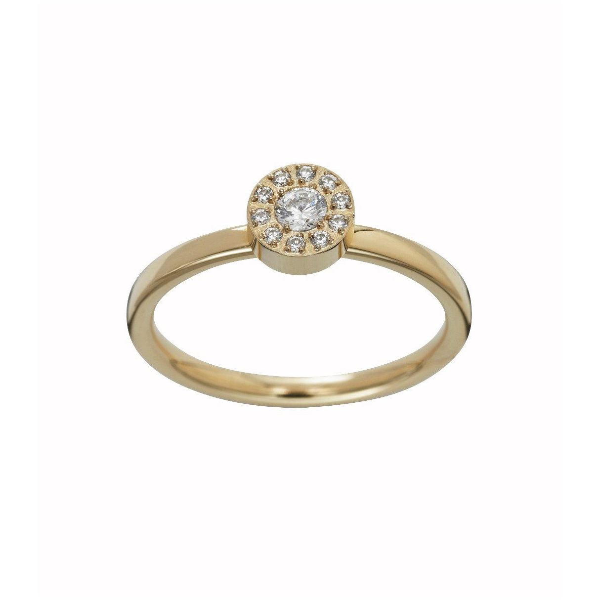 Thassos is one of the top selling lines with several pieces to mix and match for both everyday and more festive occasions. Thassos Ring Mini features a round ornament with one large and 10 smaller clear stones set in a rounded rail in 14K gold plated stainless steel.