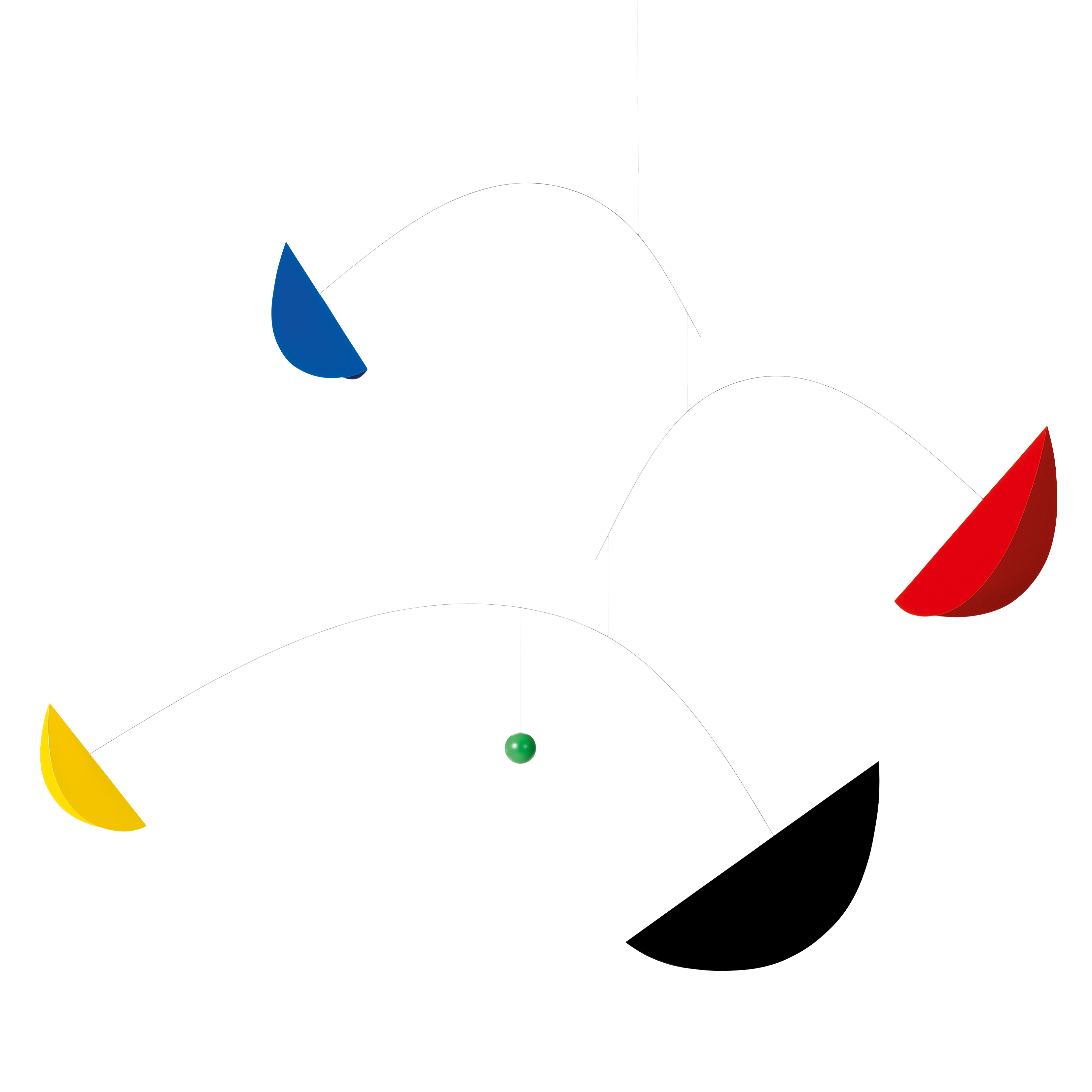 Designed in 1994, the Life and Thread mobile is inspired by the idea that life is hanging by a thread. This mobile represents a globe situated between night & day and heaven & Earth. It includes extra half moon shapes, so the color combination can be changed to suit your moods.