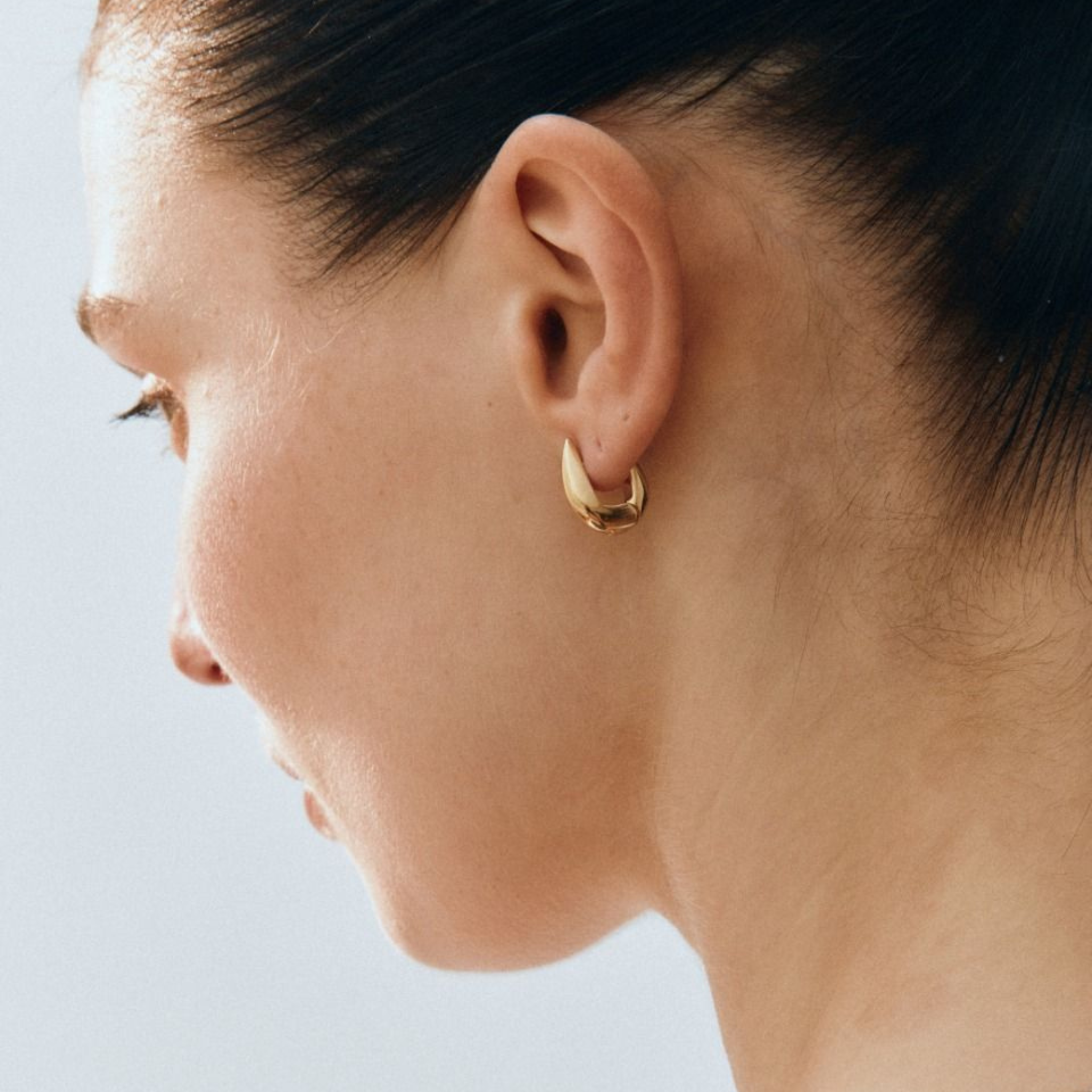 Crest earrings are designed to sit high on the ear with their pointed end and narrow drop shape. Seen here in shiny 14K gold plating, these Crest Hoops S are ideal for everyday wear.
