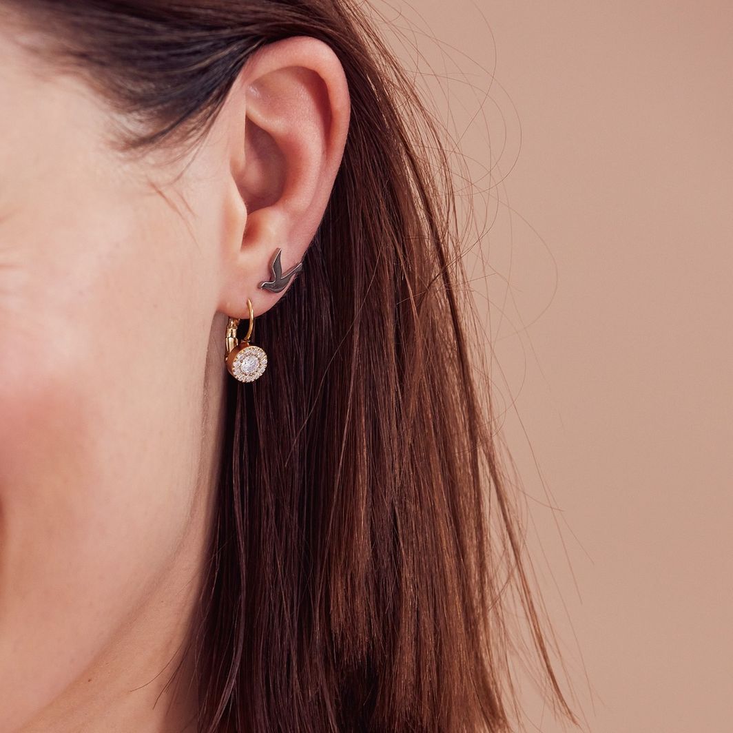 Thassos is one of our top selling lines with several pieces to mix and match for both everyday and more festive occasions. The line also makes for a great gift. Thassos Earrings with French hooks are a new addition to the line and look great on. The small round ornament features one large and 11 smaller clear stones set in in shiny 14K gold plating.