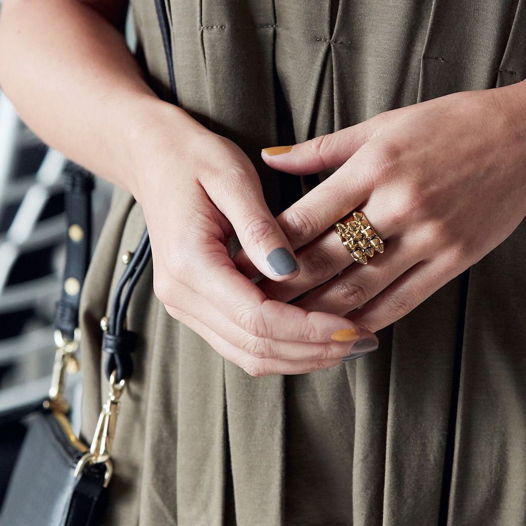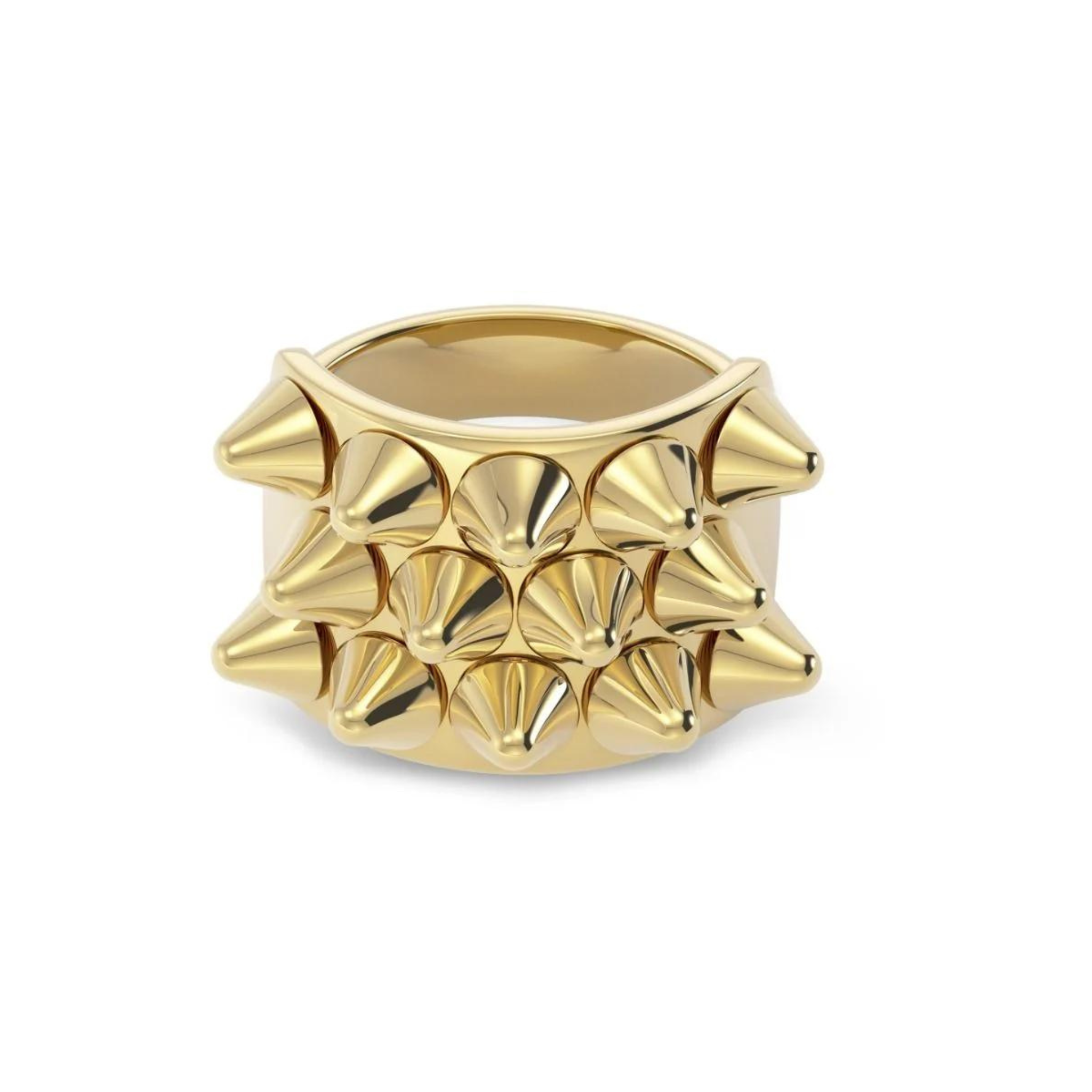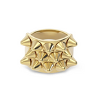 Peak, a requested favorite, is a stylised statement ring with its tops that resemble punk-like spikes, seen here in shiny 14K gold plated stainless steel.