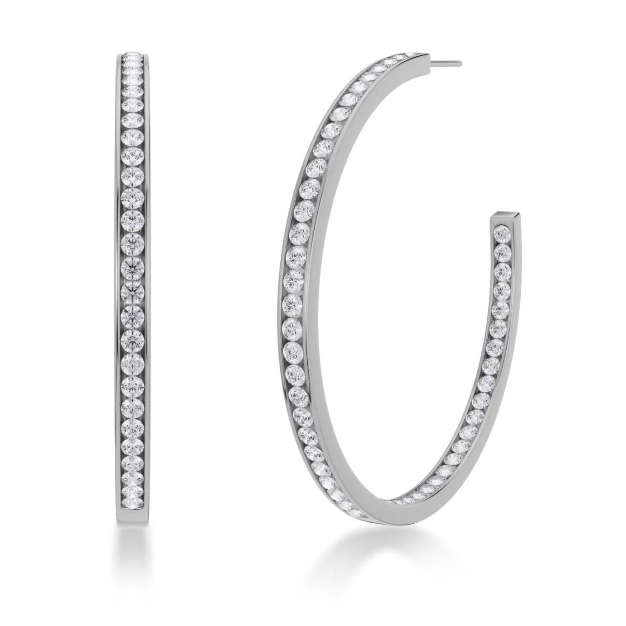 Andorra earrings feature beautiful clear stones on half of the outside and inside. The combination of the shiny steel and the stones makes for a striking earring. A perfect party piece.