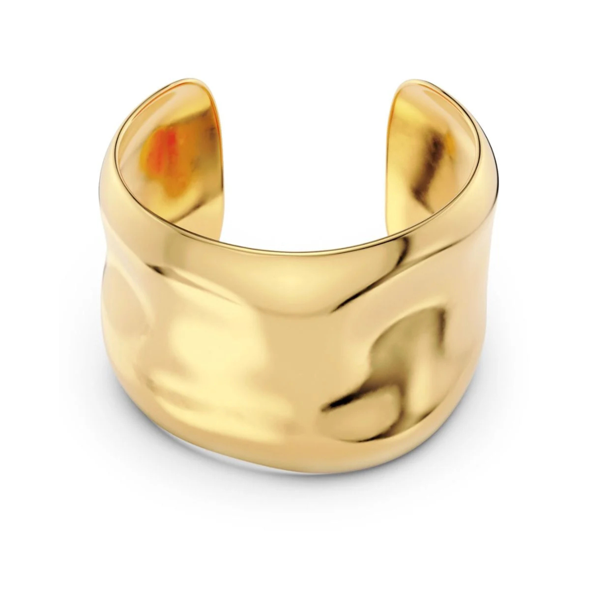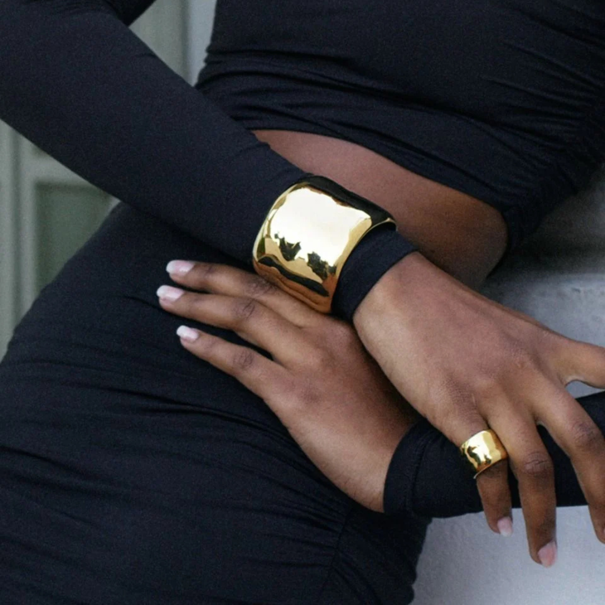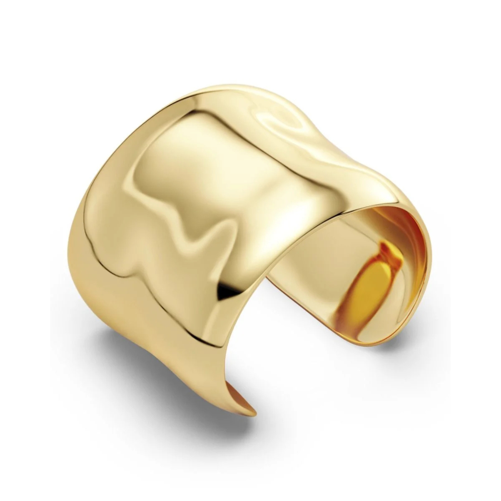 Flowy Bangle is the epitome of a statement bracelet, showcasing the trend of oversized metal jewellery in a bold and maximalist design. This bracelet is a must-have for any party, and for a complete ensemble, you can pair it with the Flowy ring. Flowy Bangle is seen here in shiny 14K gold plating, adding a touch of elegance to your party look.