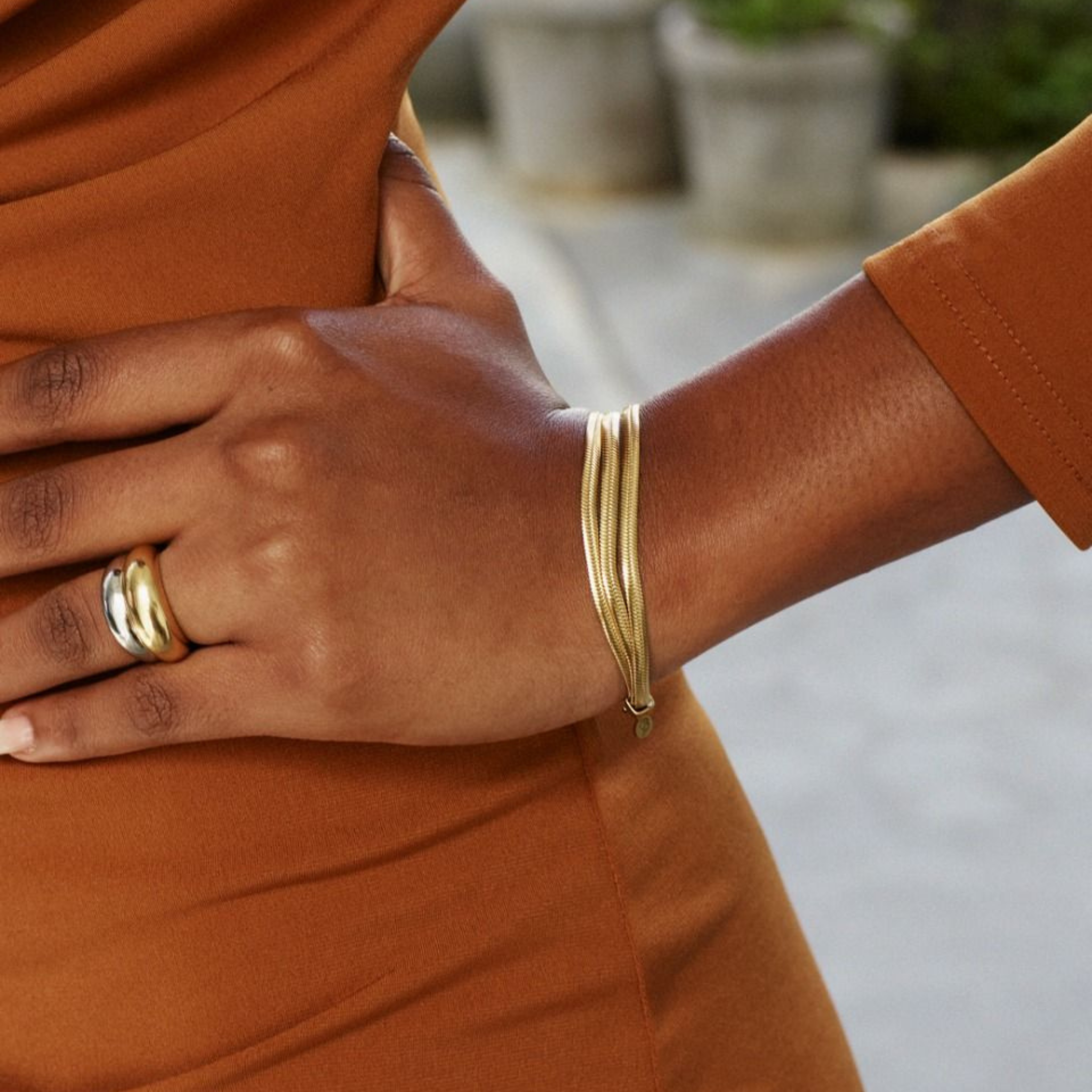 The Herringbone Triple Bracelet features three elegant classic herringbone chains, perfect for both everyday wear and festive occasions. The chains attach to a stylish clasp, seen here in shiny 14K gold plating.