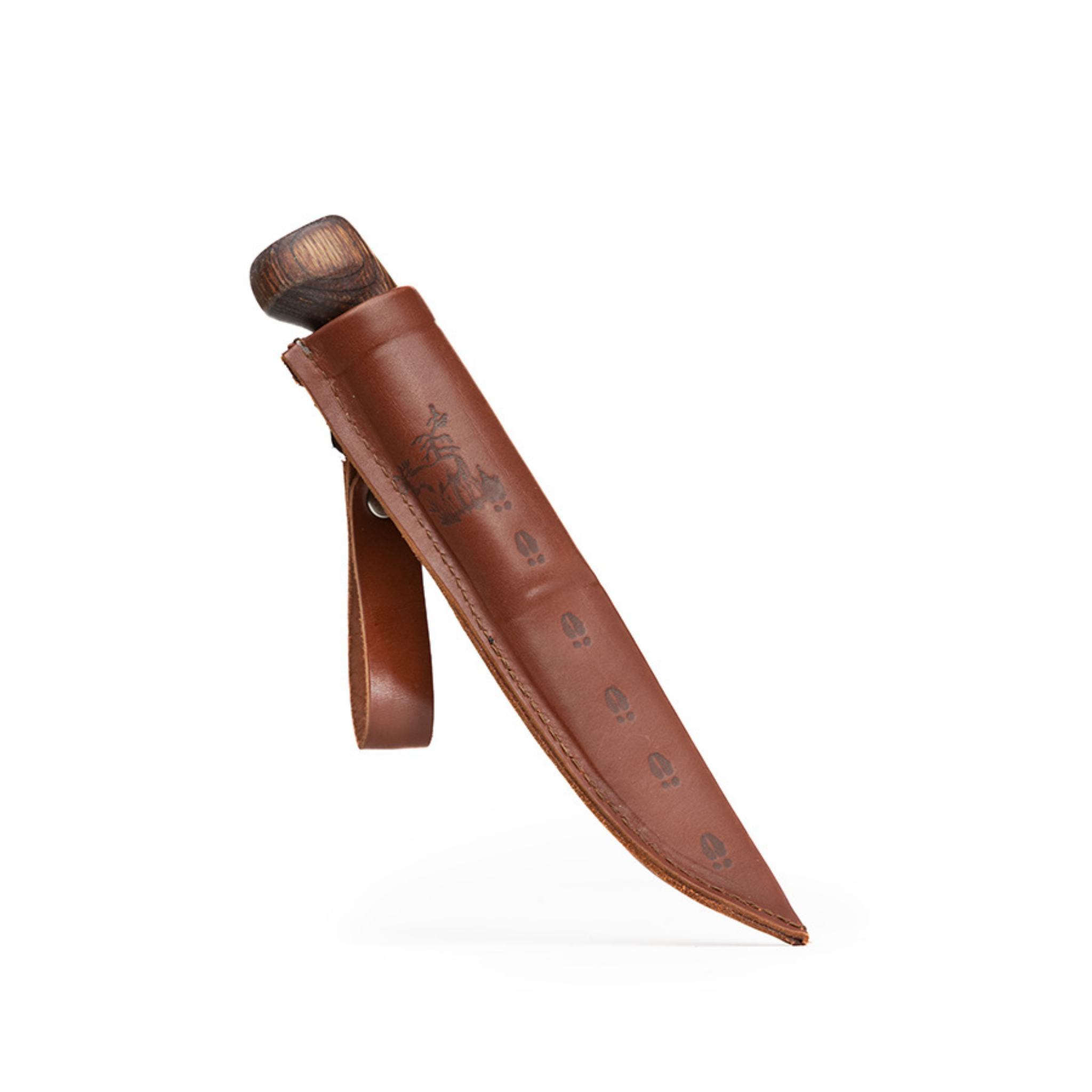 The 9.5 cm carbon steel blade is designed for versatile use, from camp chores to carving, making it a great companion for wilderness adventures. It comes with a beautifully decorated Scandinavian leather sheath, ensuring safe and convenient carrying. A hefty, well-balanced knife, perfect for those who appreciate traditional craftsmanship and practical functionality in the outdoors.