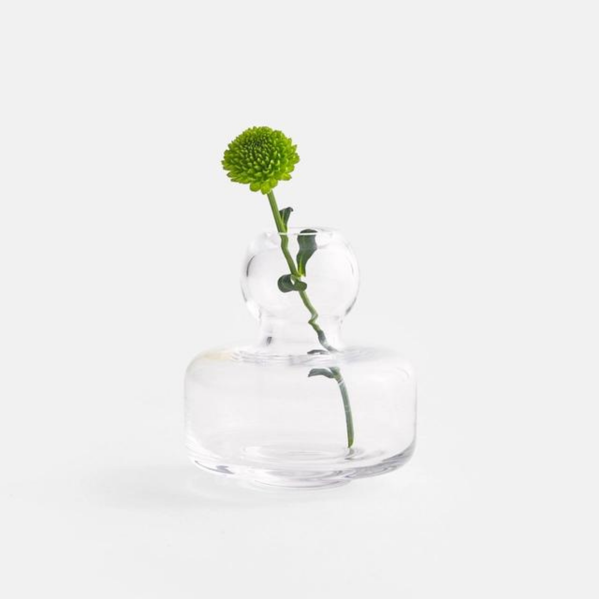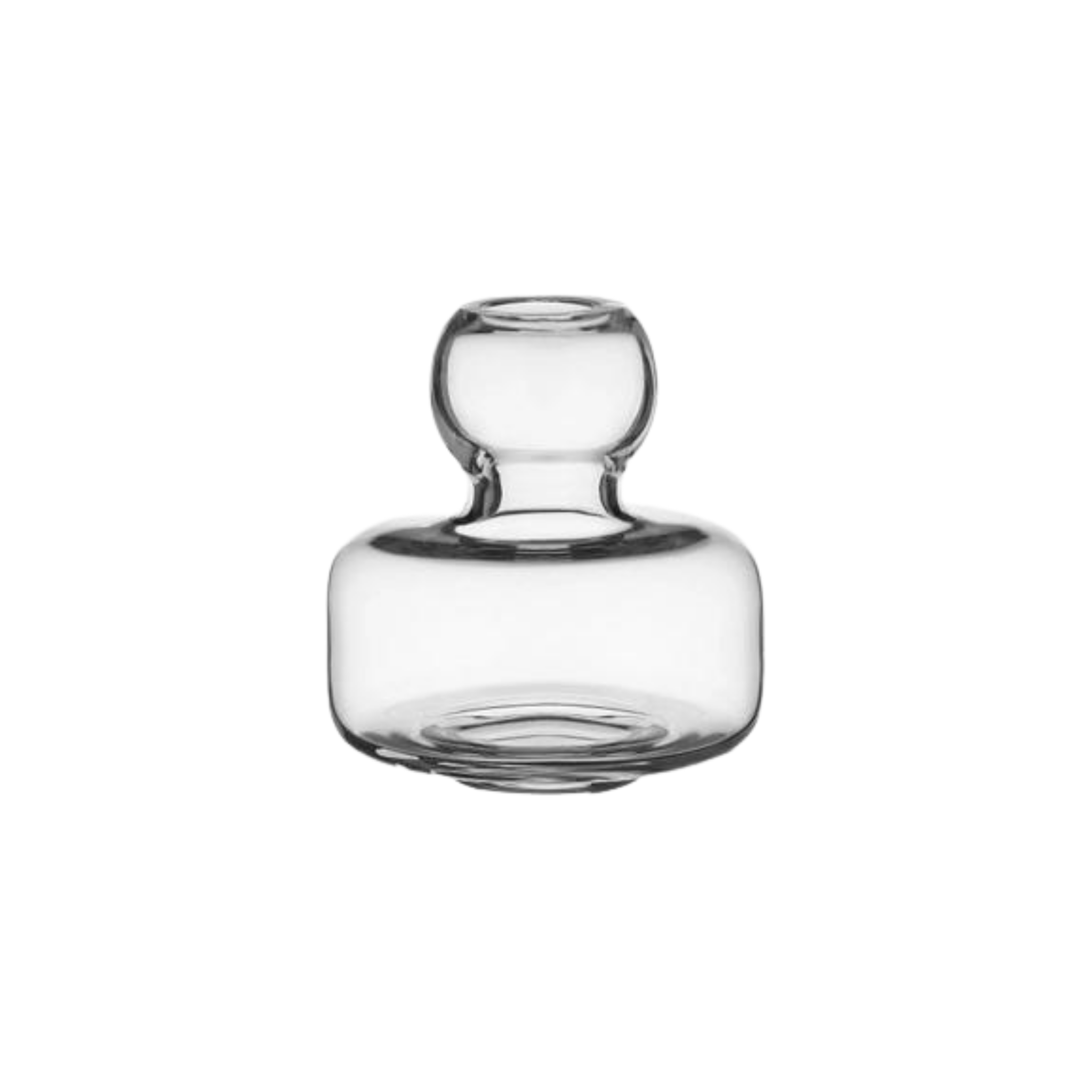 A clear small mouth-blown glass vase designed by Carina Seth-Andersson. It measures 4” x 4”.