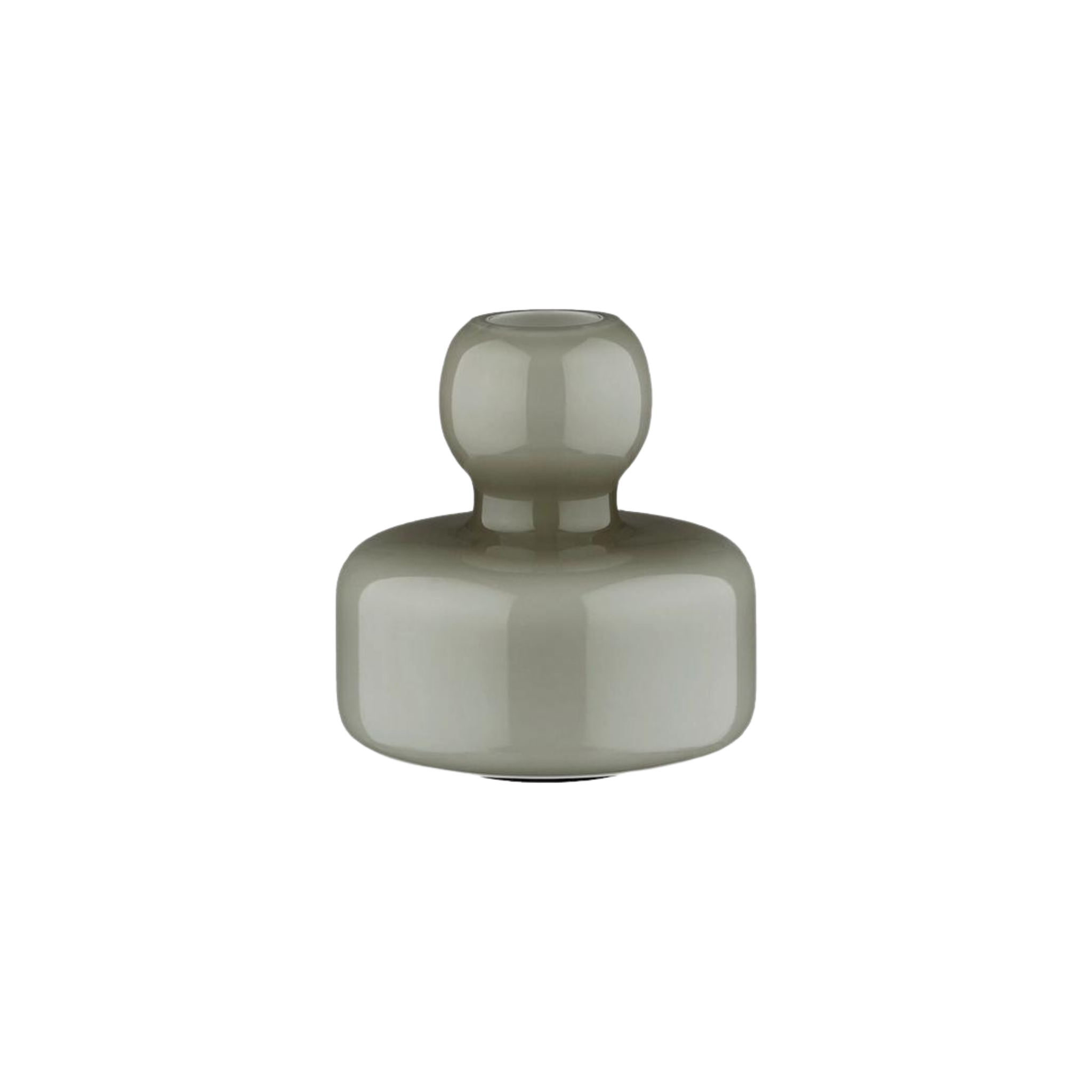 A small mouth-blown glass vase designed by Carina Seth-Andersson in an opaque sage green. It measures 4” x 4”.