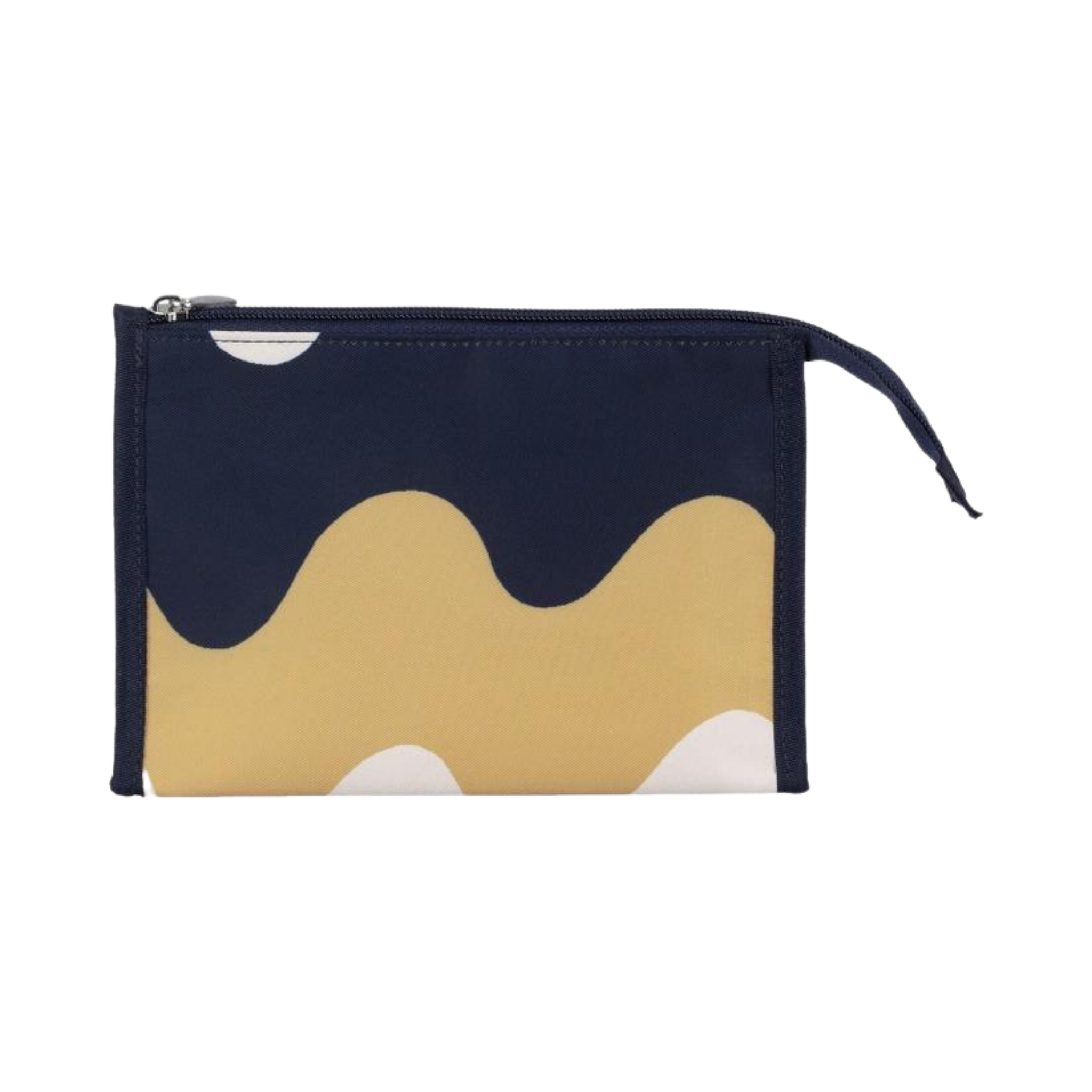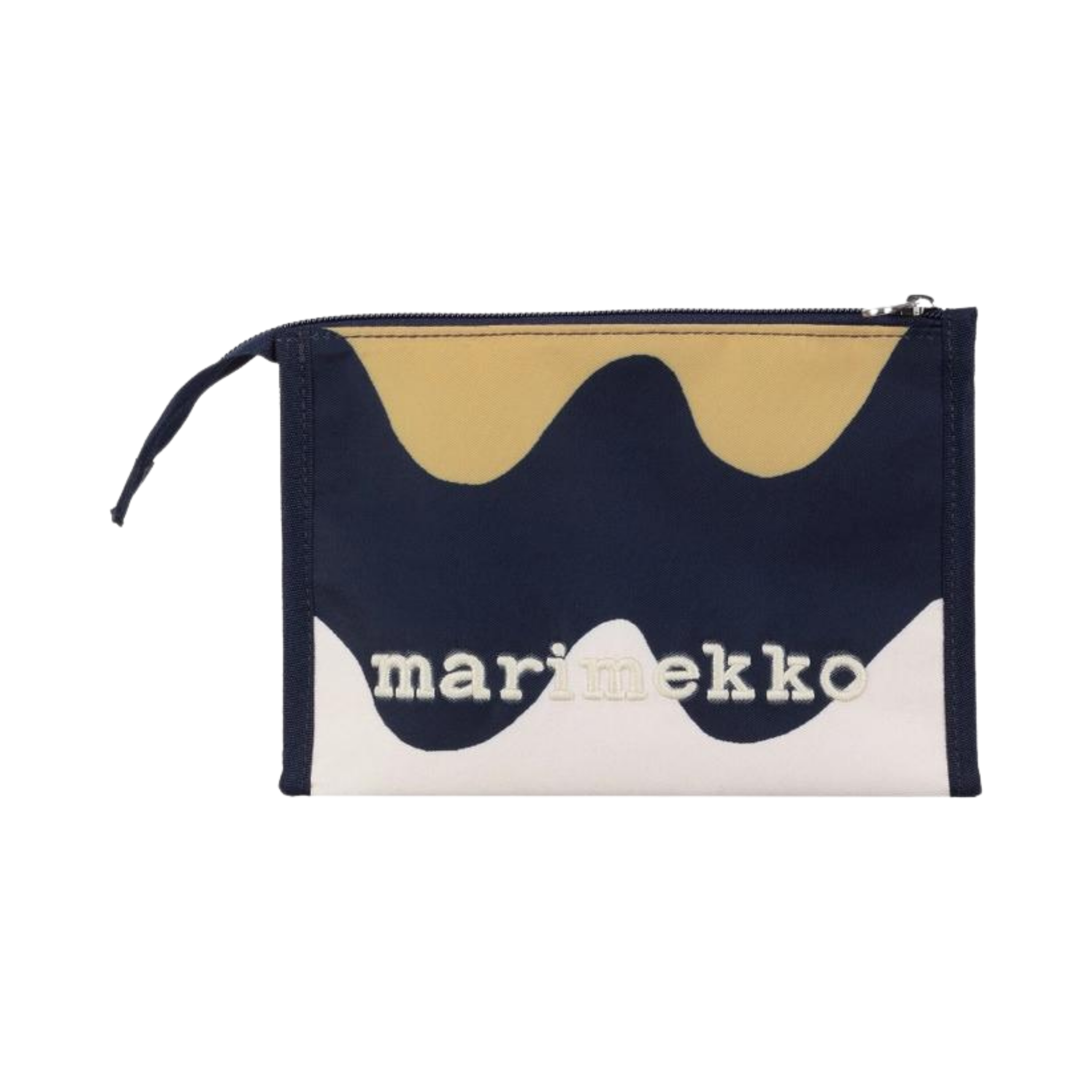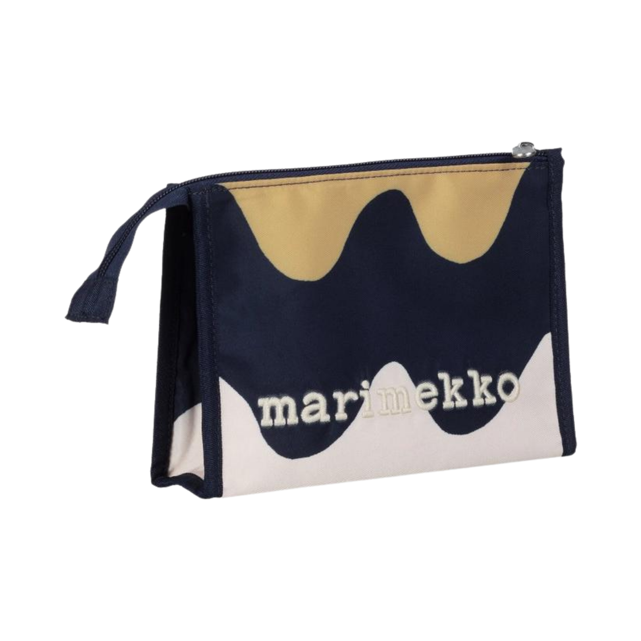 The small Hipaus cosmetic bag features the Pikku Lokki pattern, an embroidered Marimekko logo, and a zipper closure.