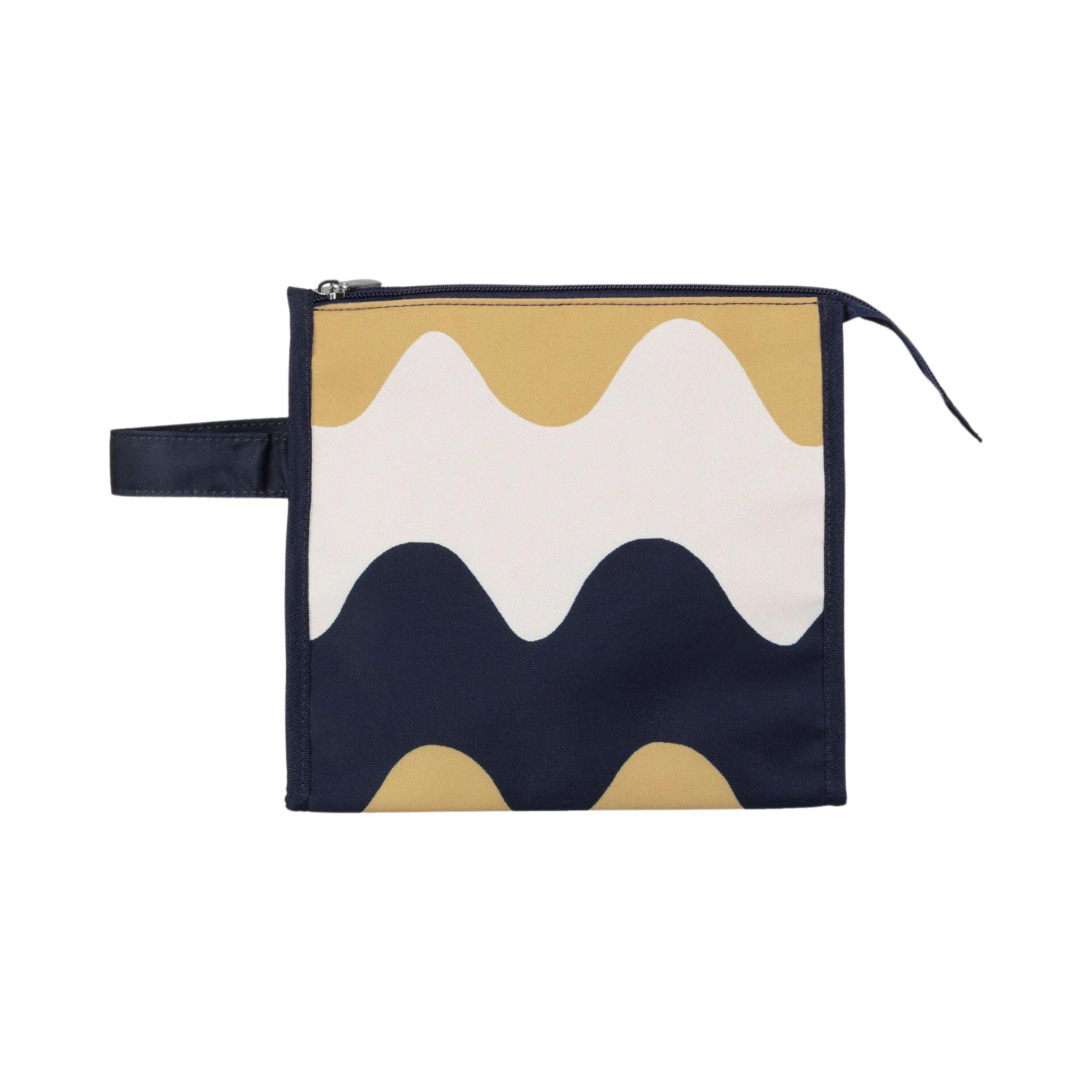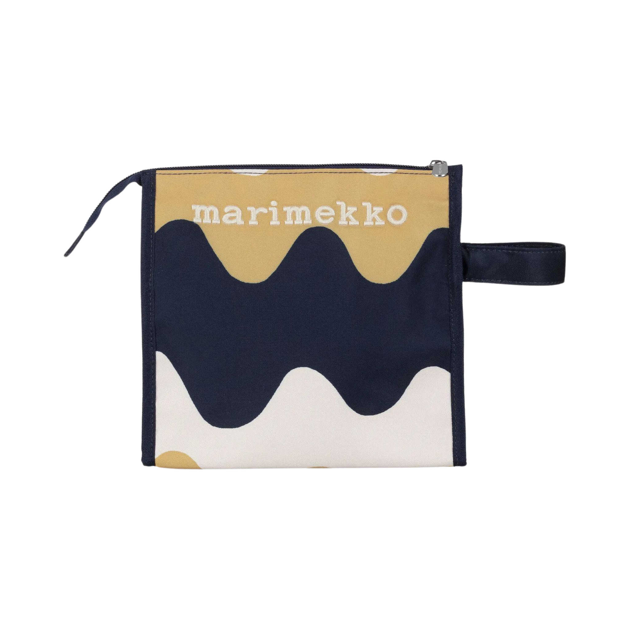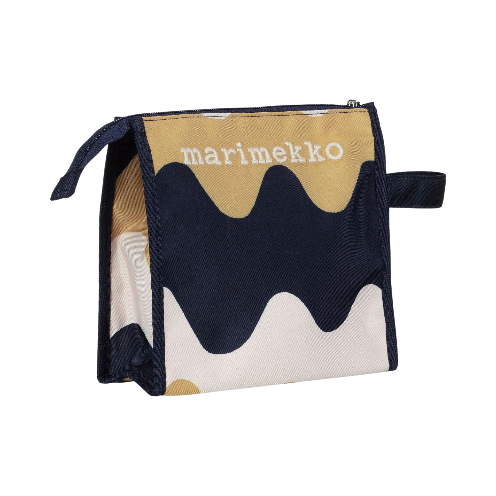 The medium-sized Nuuka cosmetic bag features the Pikku Lokki pattern and an embroidered Marimekko logo. It has four pockets on the inside and a zipper closure.
