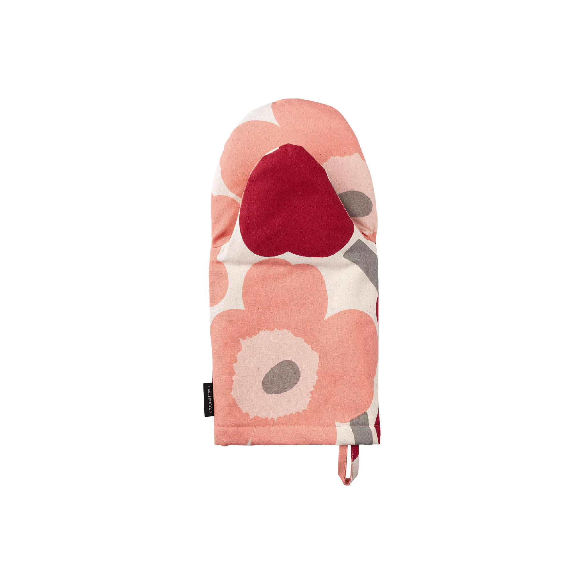 The Pieni Unikko pattern oven mitten is made of unbleached cotton, which is printed in Helsinki. The oven mitten has padded filling and hanging loop.