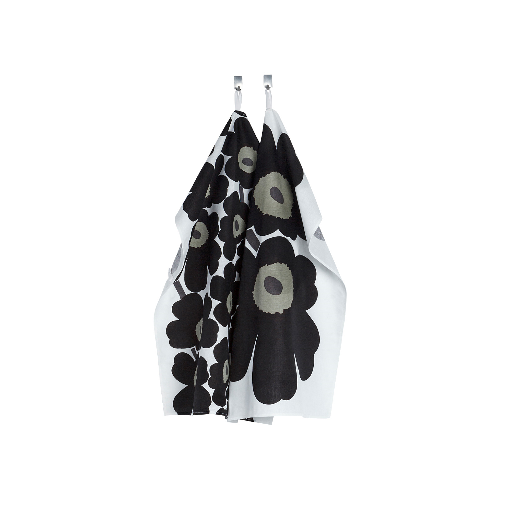 Poppy Party. Brighten up the kitchen with two multi-purpose tea towels, perfect for drying dishes, wiping hands or as an impromptu pot holder when need be. There are two towels per set; each features the Unikko print in different flower sizes. The slightly textured woven fabric is made of 55% cotton, 45% flax (linen).