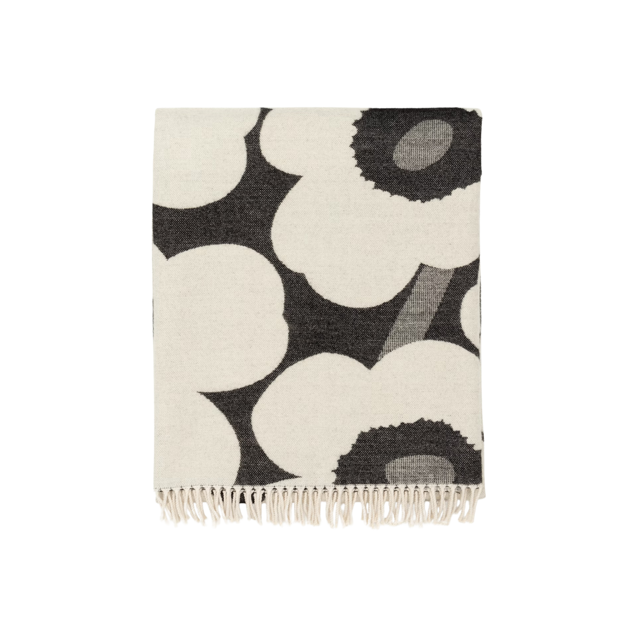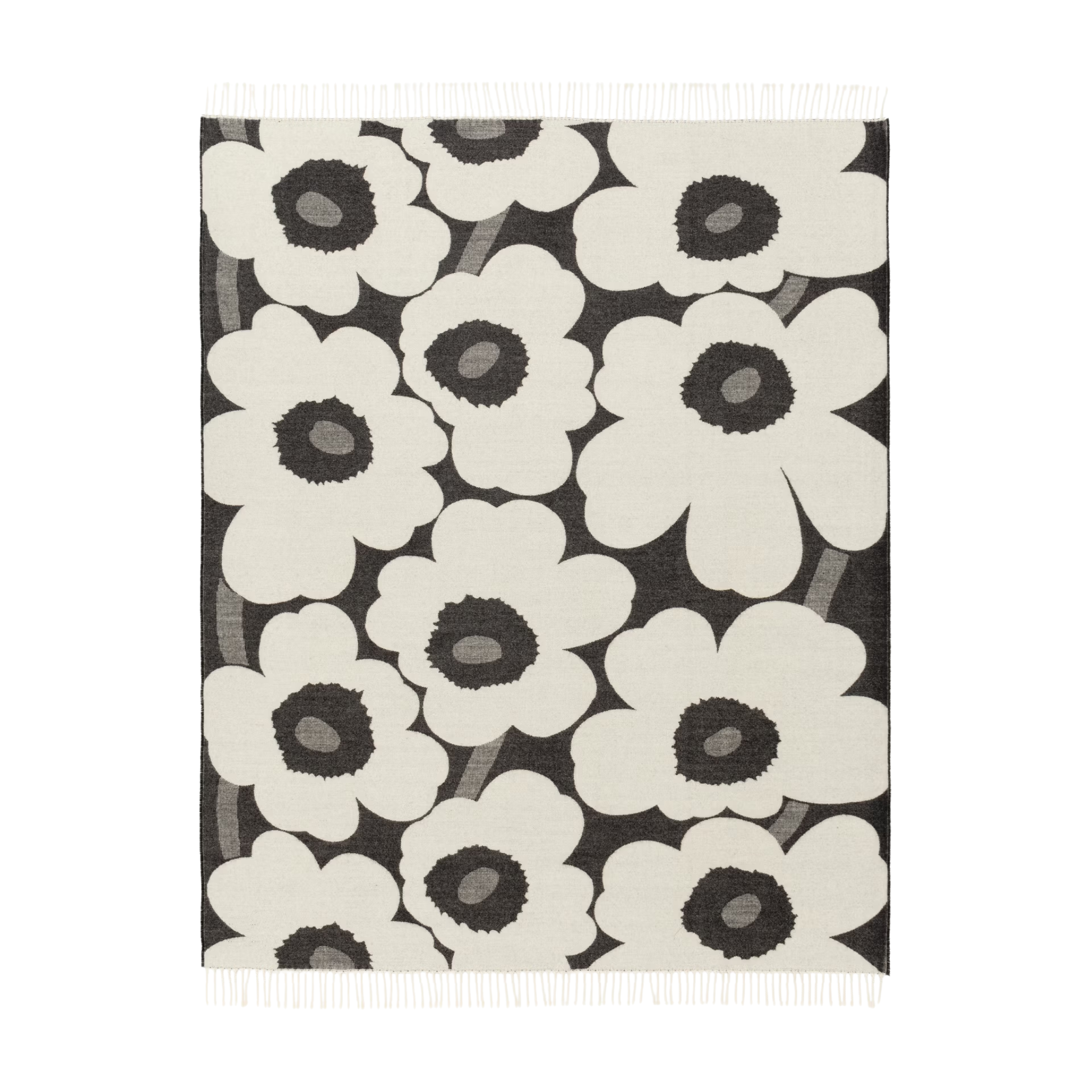 This beautiful wool and cotton blend blanket with fringes at the ends is sure to keep you warm. Decorated with the black and white Unikko pattern, the blanket has two different sides, with the backside being a clever color negative of the front. Measurements: 51" x 70". Products woven with the jacquard technique may vary slightly in size.
