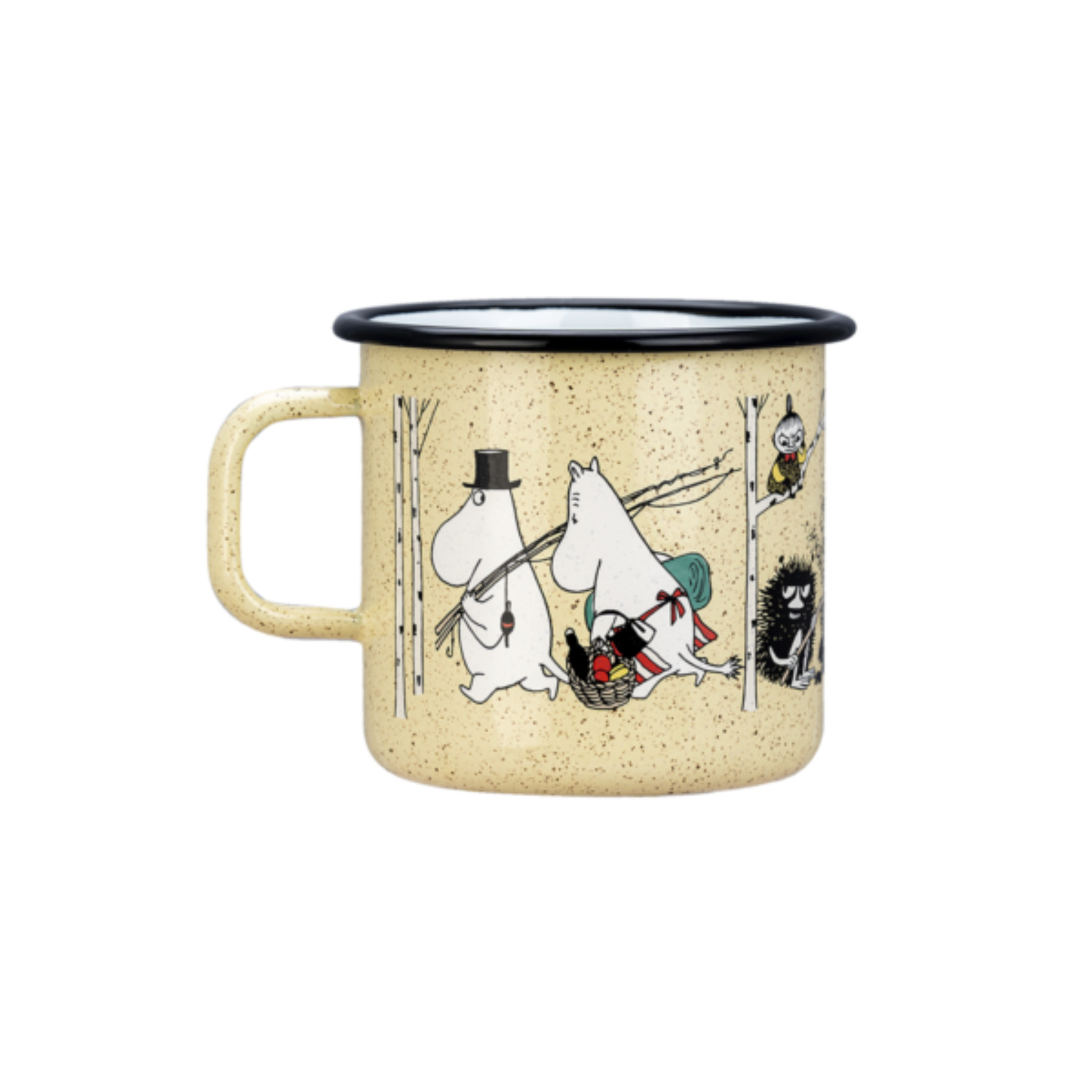 Outdoor living with the Moomins! Moomin family loves to go on picnics, camping and on adventures in the forests and mountains surrounding the Moominvalley. This 8dl enamel mug is a great companion for the real-life adventures. In addition to using it as a jumbo size mug, you can also use it for example for soup, and you can even heat the soup inside the mug on your campfire. Muurla’s enamelware consists of a carbon steel core that carries a double-coating of enamel. Being durable and light, enamel products are perfect for both indoor and outdoor use.