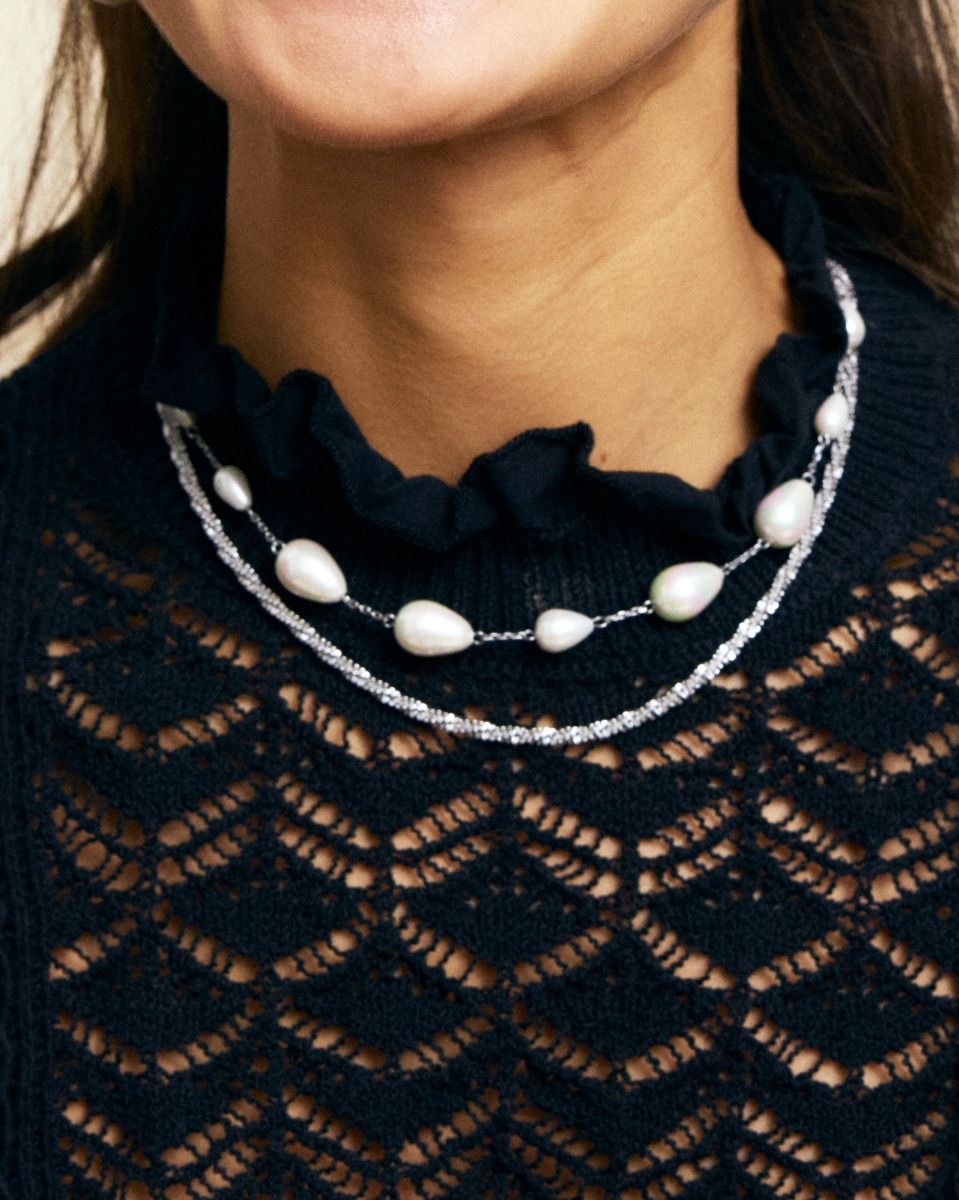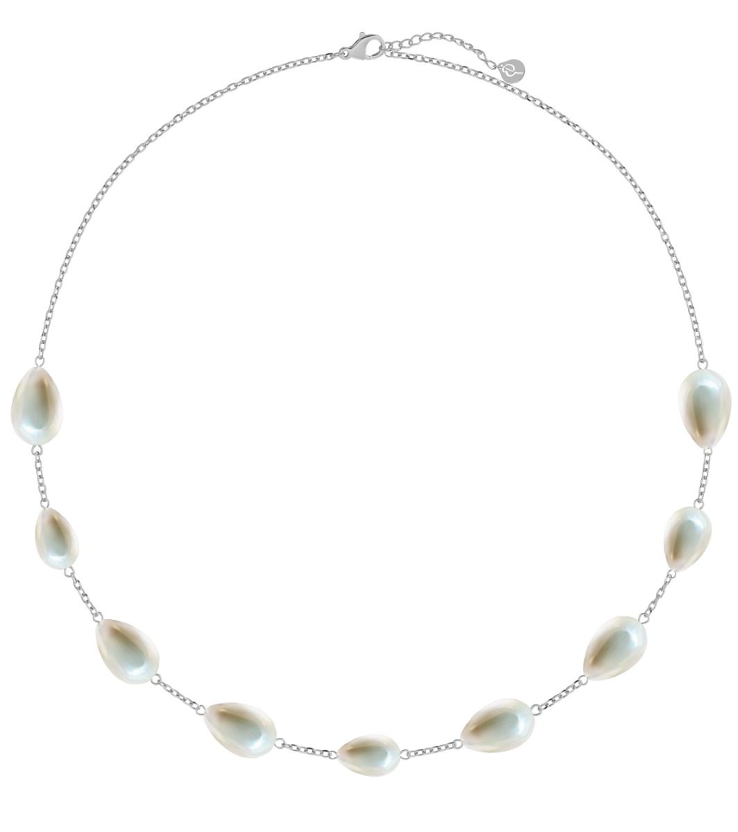 The Angeleno features a selection of stunning teardrop-shaped mother-of-pearl beads that capture the 'pearls meet chain' trend. Elevate your party style with the nine-bead necklace. The pearlsar e attached to a beveled anchor chain, seen here in shiny stainless steel.