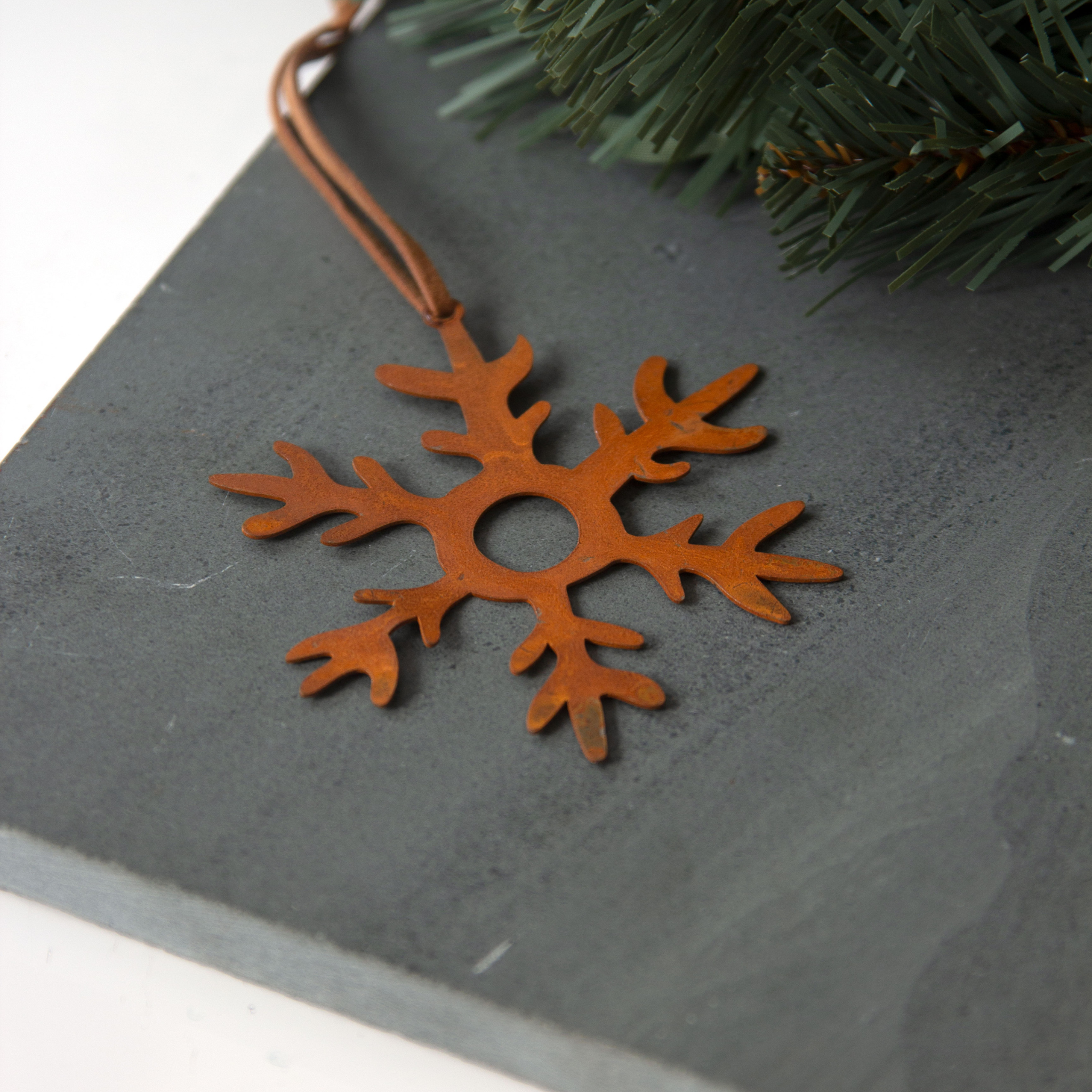 Hanging deco in a rusty coloured metal with a snowflake motif.