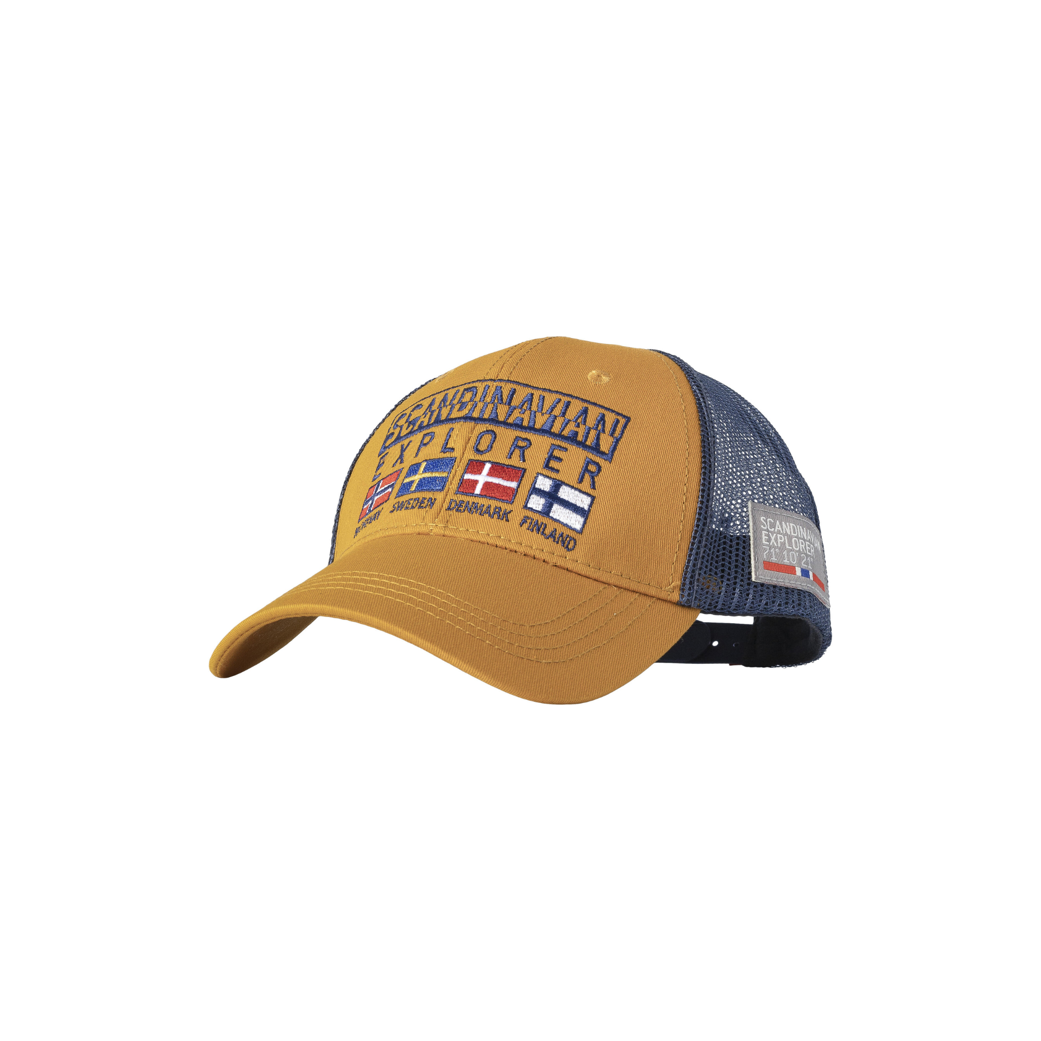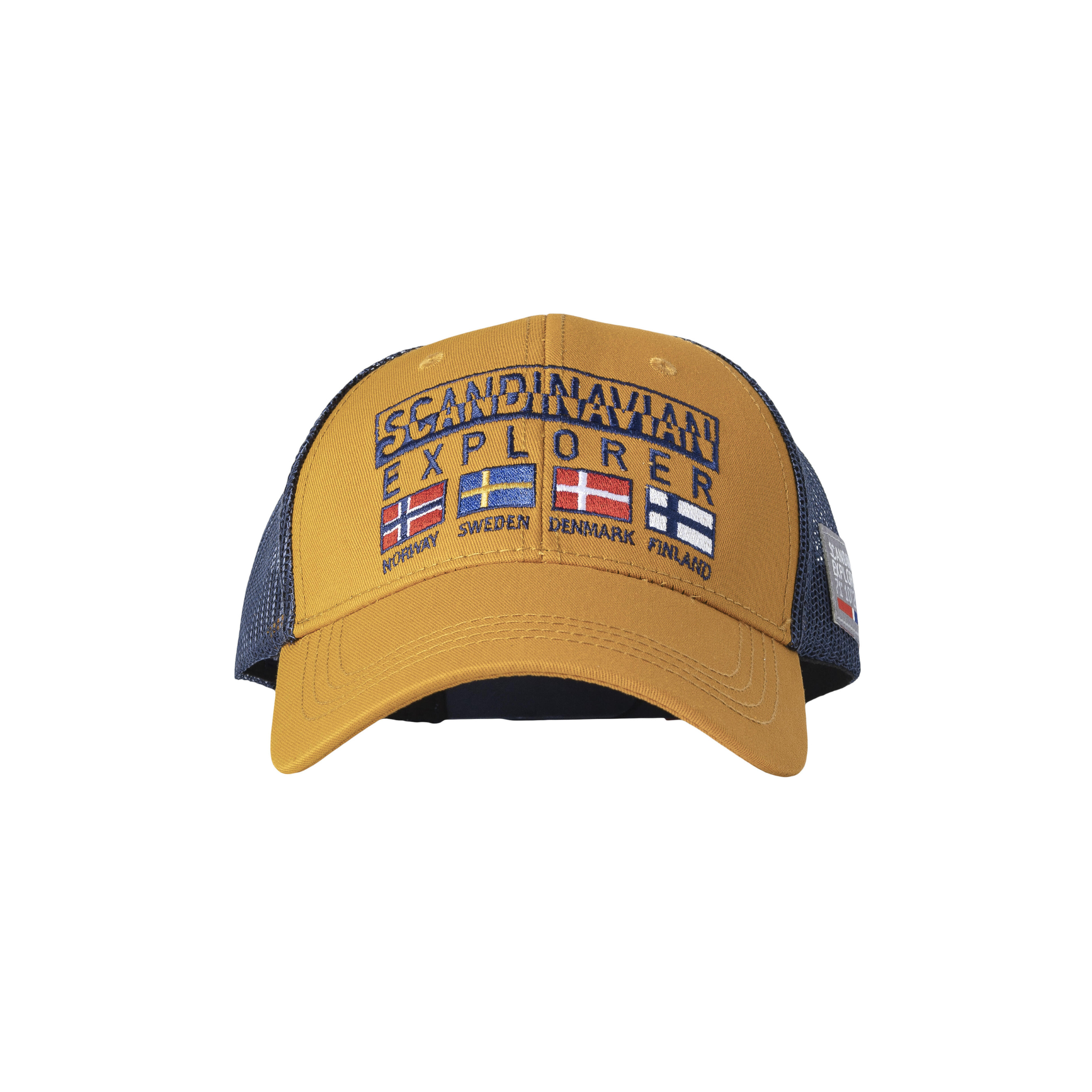 Unisex hat with embroidered Norwegian flag and print. One size fits all with adjustable strap in back.