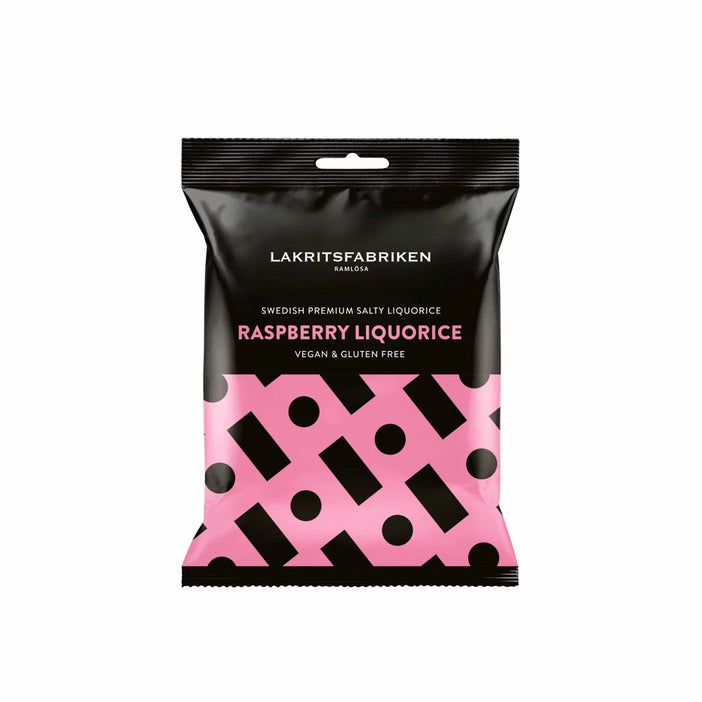 A 100g bag filled with juicy, gluten-free and vegan salty soft licorice with a fresh taste of raspberry in a pink color.
