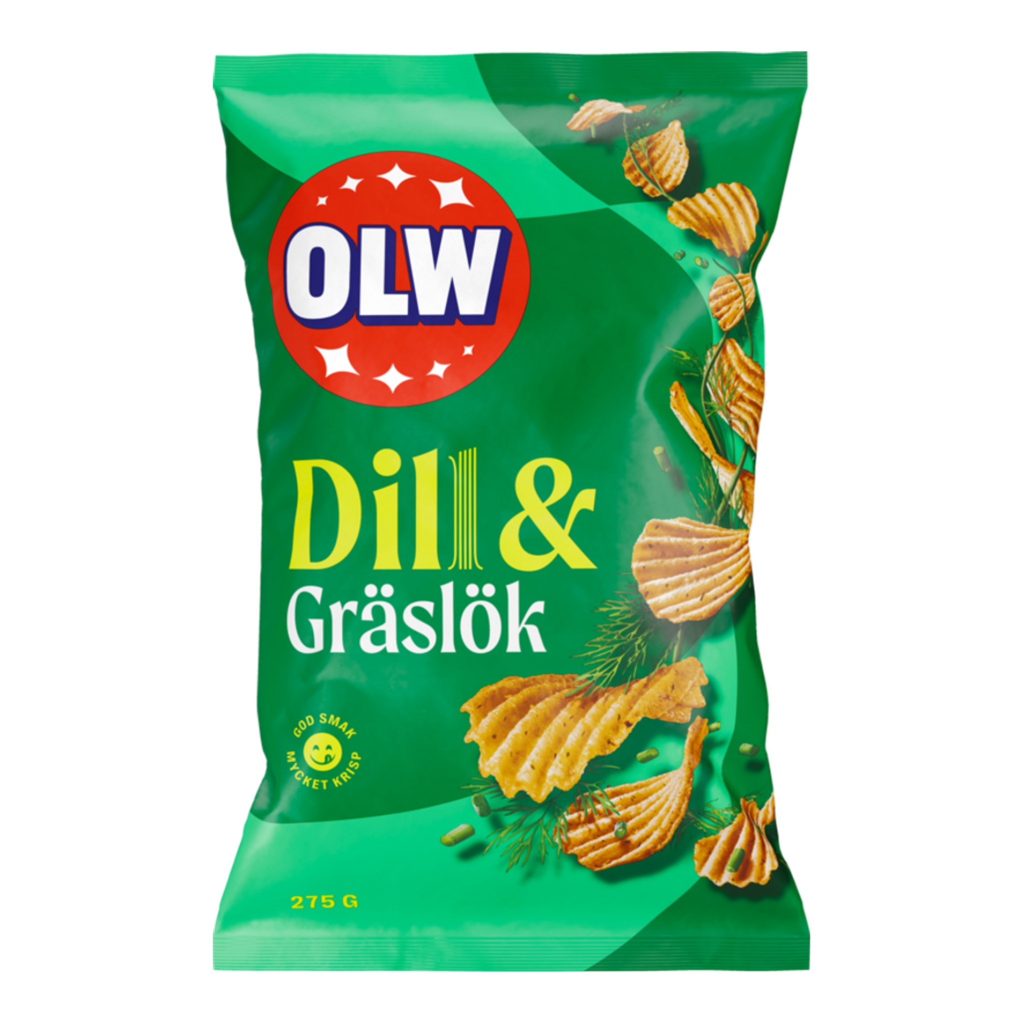 Ridged potato chips fried in 100% sunflower oil, coated with a dill & chive seasoning. A Swede's delight! 175g Bag