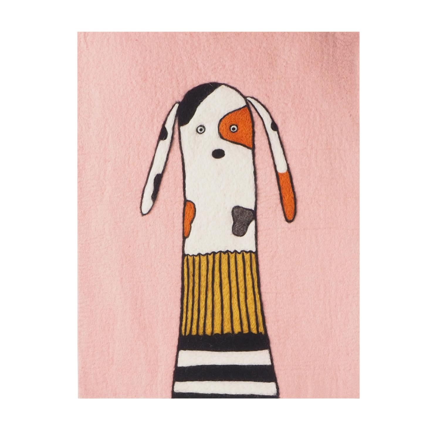 Happy and friendly dog, just waiting with patience. In a pink room. Felted by hand in natural, azo-free colors. Made from soft, absorbent wool, this decorative wall hanging will help to dampen the sound in the room and bring a wonderful sense of happiness and joy.