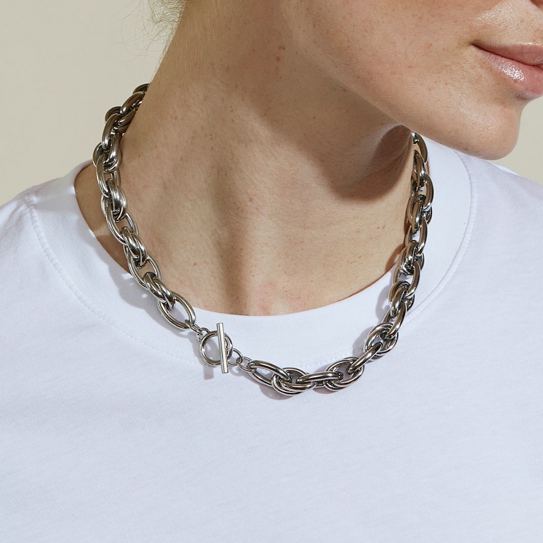 Cadena is this season's chunky chain with large oval links and double links. This is a bold statement necklace that can be worn both day and night. Cadena features a lovely T-lock that doubles as a feature piece, seen here in shiny stainless steel.