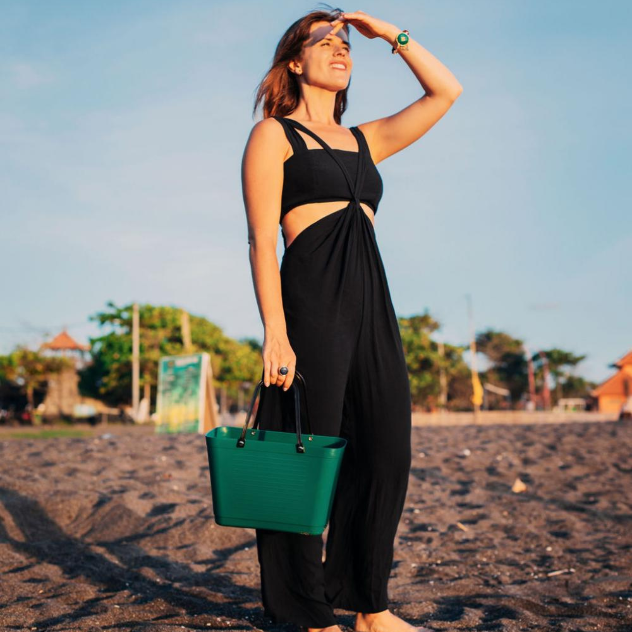 This is the mini Hinza tote. Perfect for shopping, trips to the beach, picnics or storage around the house. It has a seamless sturdy structure so can stand on its own and is made so you can easily wipe or rinse off any dirt.