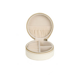 Jewellery Travel Case S is a small, round case which is ideal for travel or storing your jewels at home. The case is elegantly lined in velvet and features a compartment for rings and studs, as well as another one for other pieces. The lid has an elasticated pocket. Made from Saffiano faux leather, the case is seen here in vanilla white and gold-coloured metal accents. Jewellery Travel Case also makes a great gift!